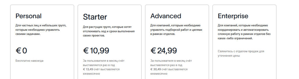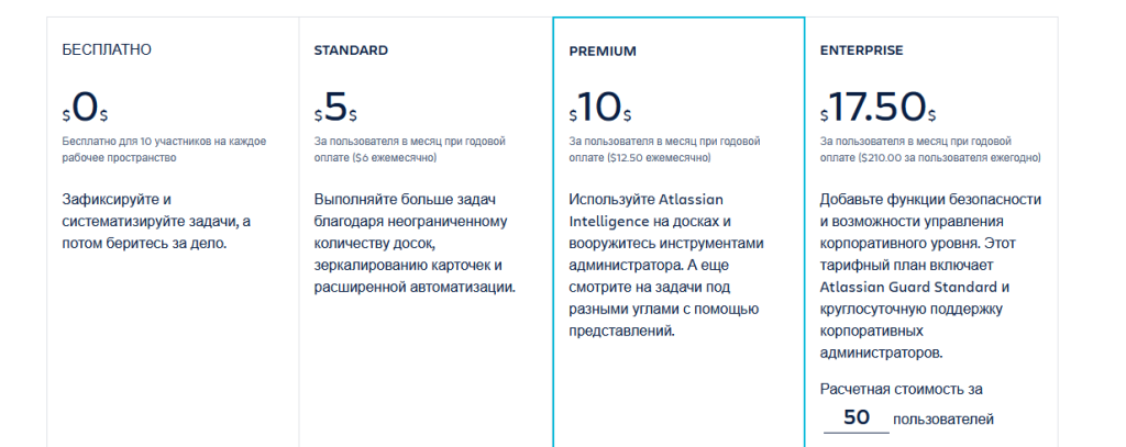 Тарифы: Free — $0 (до 10 досок/Workspace, 10 МБ/файл, базовая автоматизация). Standard — $5/польз./мес (год). Premium — $10/польз./мес (год). Enterprise — $17.50/польз./мес (год).