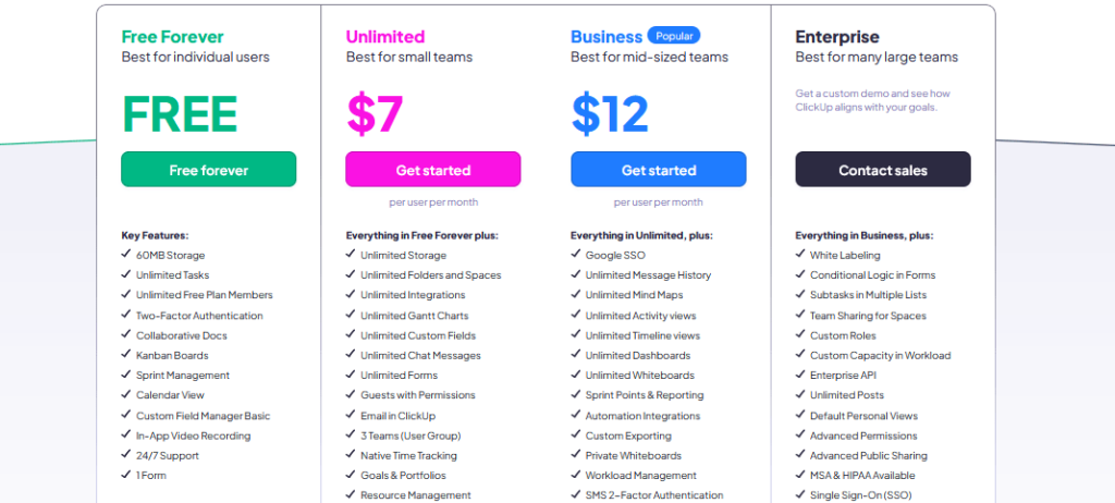 Тарифы: Free Forever — $0. Unlimited — $7/польз./мес (год). Business — $12/польз./мес (год). Enterprise — по запросу.