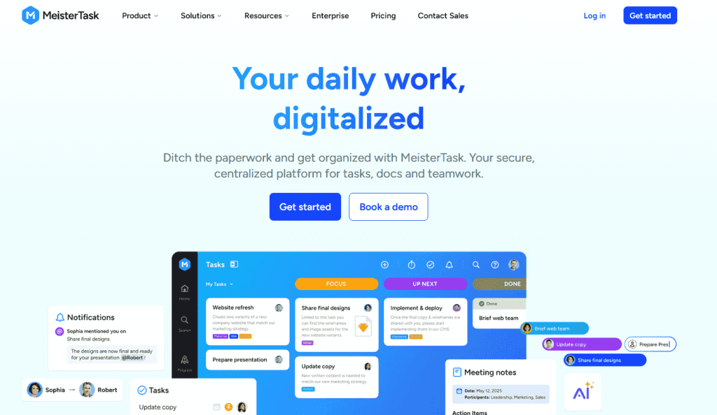 MeisterTask — визуальный таск‑менеджер с канбан‑досками, таймлайном, автоматизацией и шаблонами. Есть интеграция с MindMeister для карт идей. Соответствует GDPR, развёрнут в Германии; ориентирован на прозрачность и контроль.