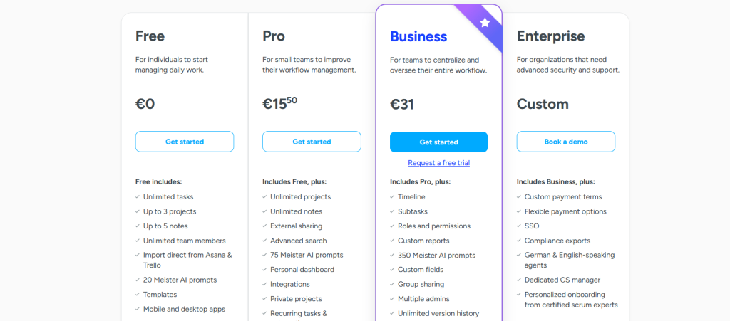 Тарифы: Free — €0 (безлимит задач, до 3 проектов). Pro — €13.50/польз./мес. Business — €24/польз./мес. Enterprise — по запросу.