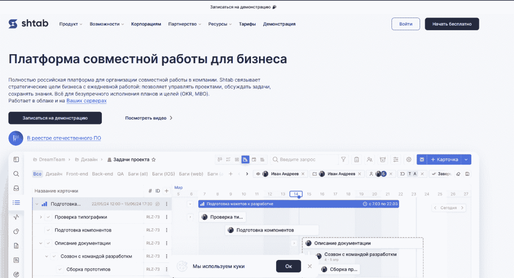 Shtab — сервис управления проектами и временем: список, канбан‑доски, календарь, Гант, матрица Эйзенхауэра и таймлайн. Сильный тайм‑трекер со скриншотами и размытием данных, финансовый модуль «время → зарплата → расходы» и аналитика. Платформы: веб, десктоп (Windows/macOS), iOS/Android.