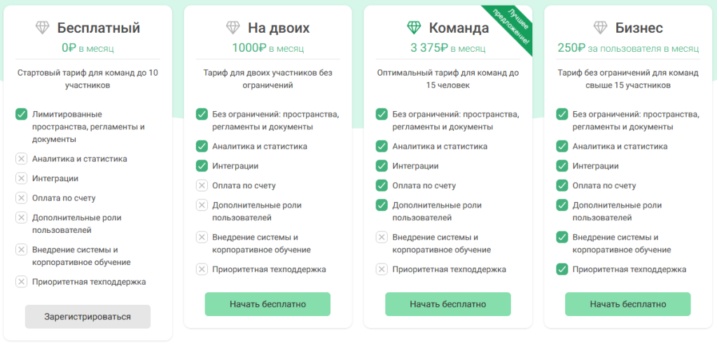 Тарифы: Бесплатно — до 10 пользователей (ограничения на пространства/документы, без аналитики и интеграций). «На двоих» — 1 000 ₽/мес за аккаунт (2 пользователя). «Команда» — 3 375 ₽/мес за аккаунт (до 15 пользователей). «Бизнес» — 250 ₽/польз./мес (15+). On‑prem — от 100 пользователей, цена по расчёту.