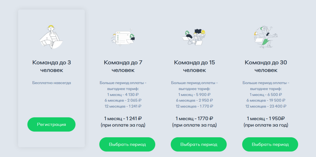 Тарифы: До 3 человек — бесплатно. До 7 — от 1 241 ₽/мес при годовой оплате. До 15 — от 1 770 ₽/мес (12 мес). До 30 — фиксированные пакеты (месяц/6 мес/12 мес).