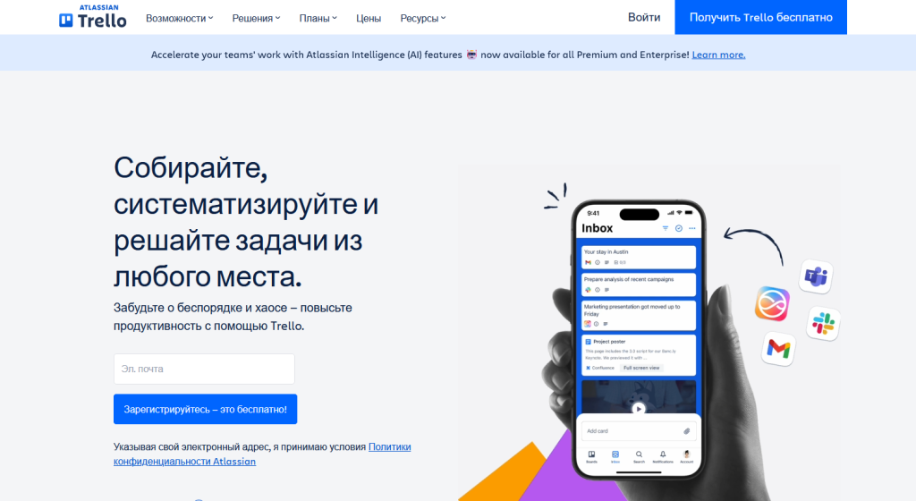 - Интеграции: Trello, Telegram‑бот, API, Zapier/Make;