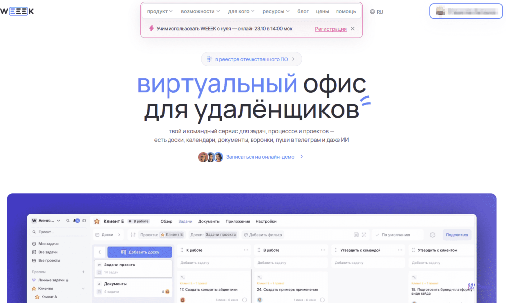 WEEEK — российская платформа совместной работы: задачи, проекты, Wiki и CRM в одном окне. Режим «Фокус» для личного планирования и «Доска» — канбан для команд. Есть уведомления (включая push), интеграции с календарями и дисками, тайм‑трекер, отчёты. Приложения iOS/Android, включая RuStore.