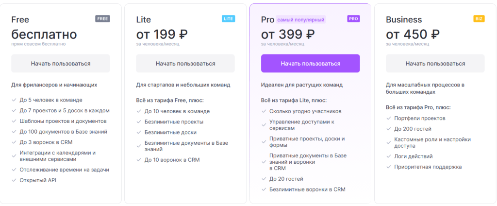 Тарифы: Free — 0 ₽/польз./мес (до 5 человек, лимиты по проектам/доскам/документам/воронкам). Lite — от 199 ₽/польз./мес. Pro — от 399 ₽/польз./мес. Business — от 450 ₽/польз./мес.