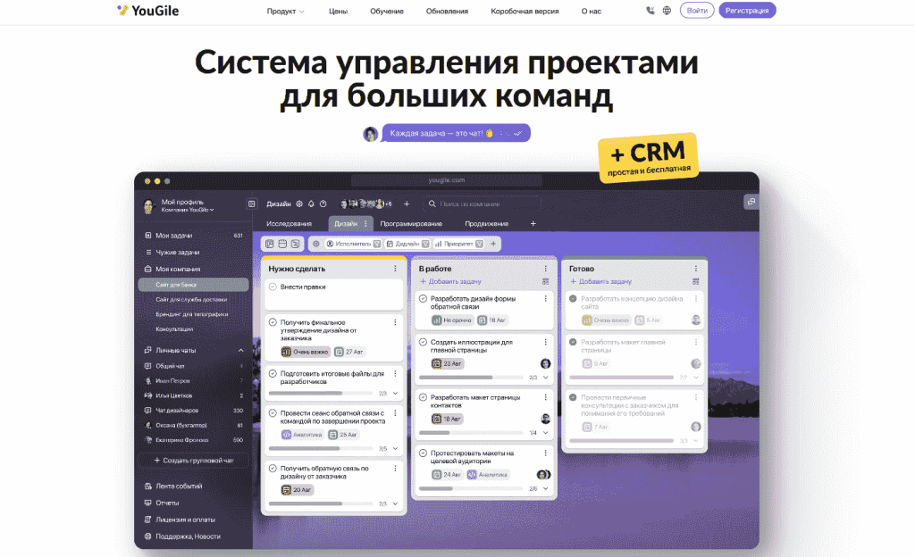 YouGile — российский Agile/Kanban‑сервис с концепцией «задача = чат»: обсуждения и файлы прямо в карточке. Есть канбан, Гант с зависимостями и автопланированием, трекинг времени, аналитика и CRM‑функции. Платформы: веб, десктоп, iOS/Android; интерфейс RU/EN.