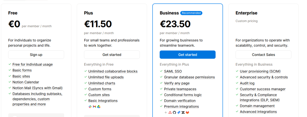 Тарифы: Free — €0 (безлимит задач; до 3 проектов; до 5 заметок; импорт; 20 AI‑подсказок; приложения). Pro — €13.50/польз./мес; Business — €24/польз./мес; Enterprise — по запросу (SSO и расширенный комплаенс). Оплата: международные карты, PayPal, по счёту.
