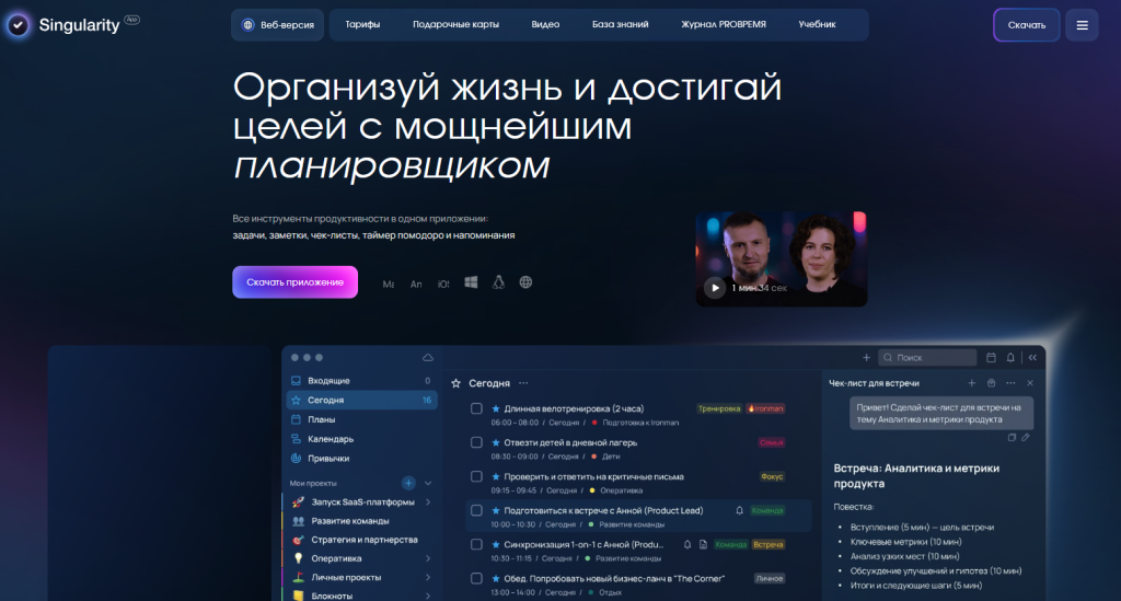 SingularityApp — российский таск‑менеджер и планировщик по методологии GTD. Подходит пользователям и небольшим командам для планирования задач, проектов и целей без избыточной сложности. Есть проекты/подпроекты, задачи/подзадачи, чек‑листы, теги/контексты и приоритеты, повторы и напоминания, календарный вид, быстрый ввод и синхронизация между настольными и мобильными приложениями.
