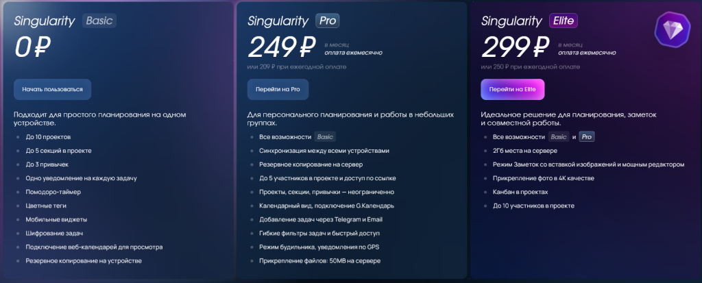 Тарифы: Basic — 0 ₽/мес (базовый функционал, синхронизация, задачи/проекты, чек‑листы). Pro — 209 ₽/мес (безлимит задач, повторы, напоминания, теги, фильтры, календарь, вложения). Elite — 250 ₽/мес (все функции Pro + расширенные фильтры, темы, аналитика, приоритетная синхронизация). Оплата: банковская карта на сайте/в приложениях, App Store, подарочные карты, зарубежная карта через англ. версию или подарочную карту, расчётный счёт.